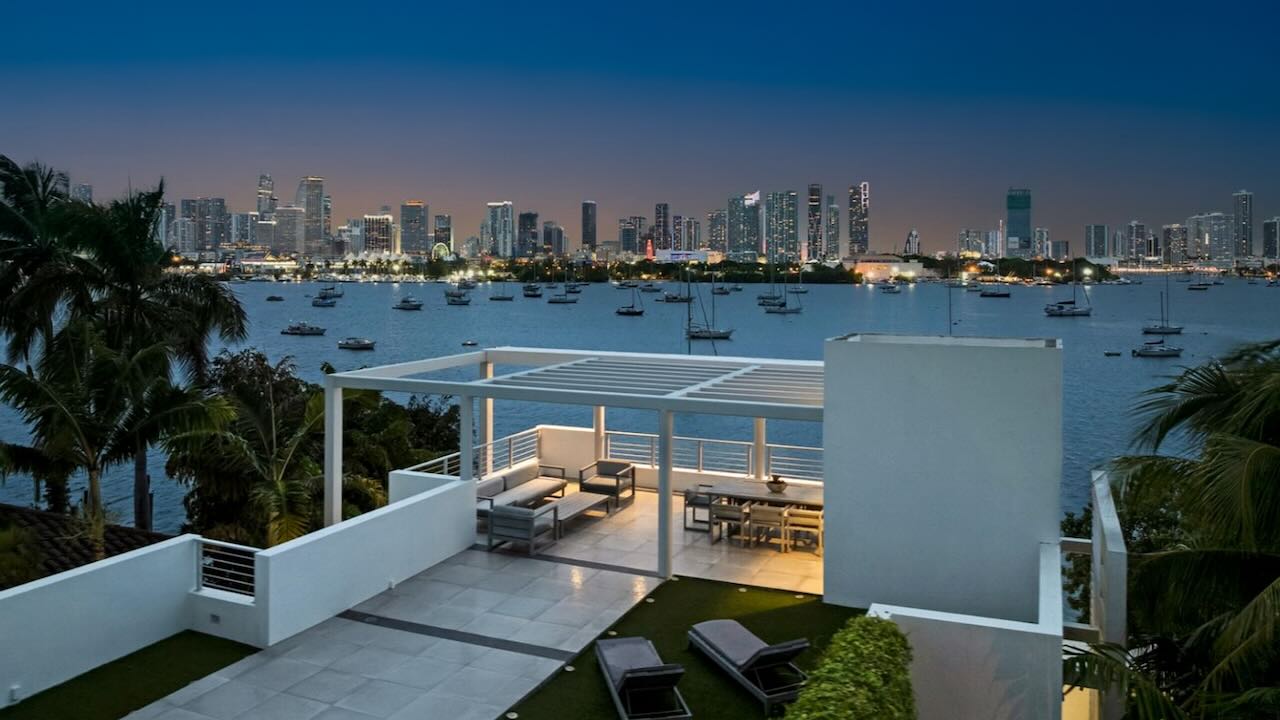 Designed by renowned architect Roney Mateu, the home features open living spaces, porcelain and oak floors, a gourmet kitchen with top-tier appliances, custom bar, private movie theatre, gym, and water-view balconies in every bedroom. Outdoor highlights include a heated infinity-edge pool, Jacuzzi with fire pit, summer kitchen, private dock with boat lift, and 85 feet of waterfront. A rooftop lounge with 360° panoramic views completes this exceptional Miami lifestyle offering.